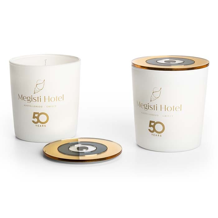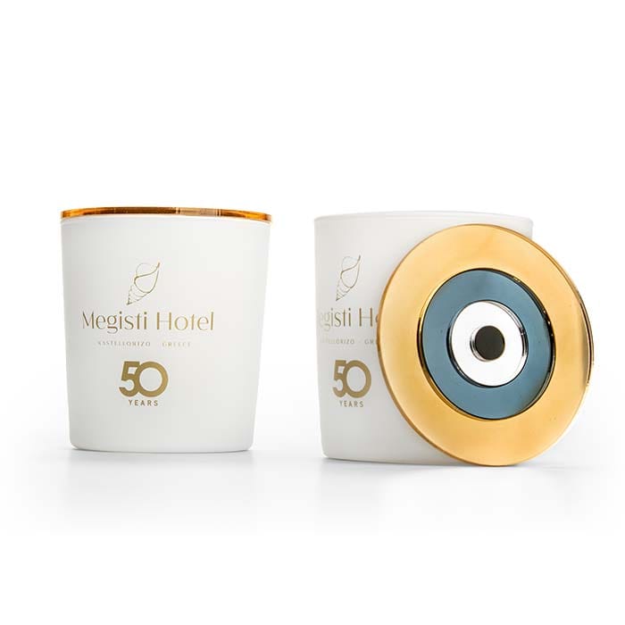 Λευκό, όπως τα σπίτια των νησιών του Αιγαίου. Χρυσό, όπως τα πενήντα του χρόνια. Και για καπάκι, ένα custom μάτι από plexiglass — αιώνιο σύμβολο προστασίας και καλοτυχίας. Το ιδιαίτερο αυτό κερί προσφέρθηκε στους επισκέπτες του ξενοδοχείου εκείνη τη χρονιά, ως ένα κομψό και συμβολικό ενθύμιο της ξεχωριστής επετείου.