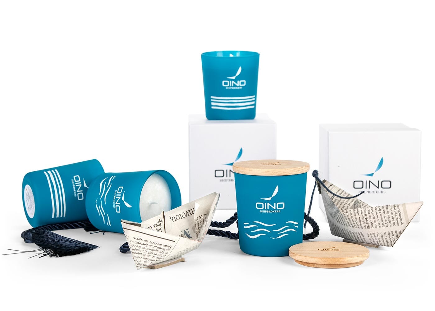 Η ναυτιλιακή εταιρεία OINO, με έδρα την Αθήνα και γραφεία σε μεγάλα εμπορικά λιμάνια της Ασίας, δραστηριοποιείται στον τομέα των ναυλώσεων ξηρού φορτίου. Για τις εορταστικές της αποστολές, επέλεξε custom αρωματικά κεριά με νότες θαλάσσιας φρεσκάδας και έντονη εταιρική ταυτότητα.