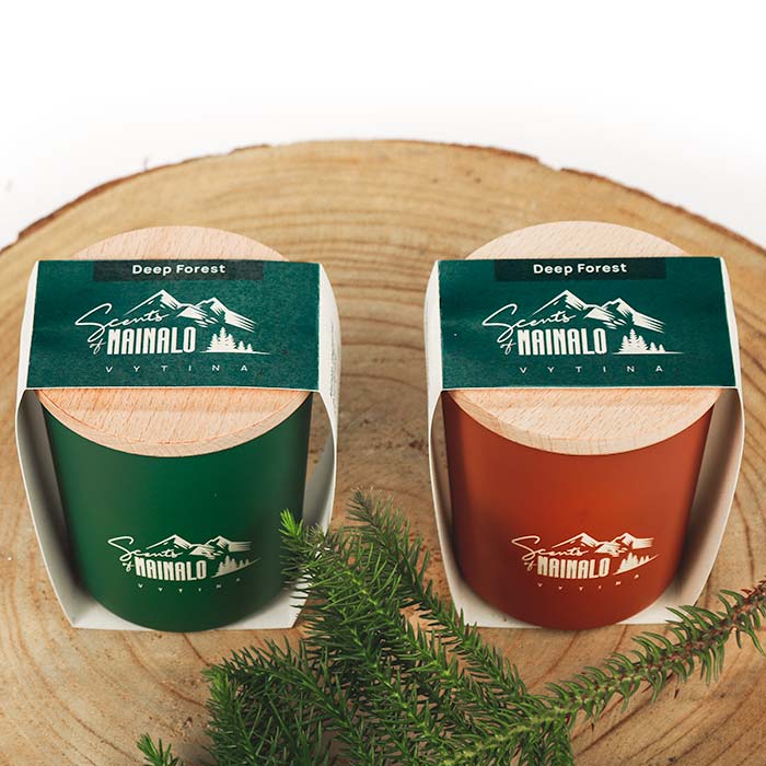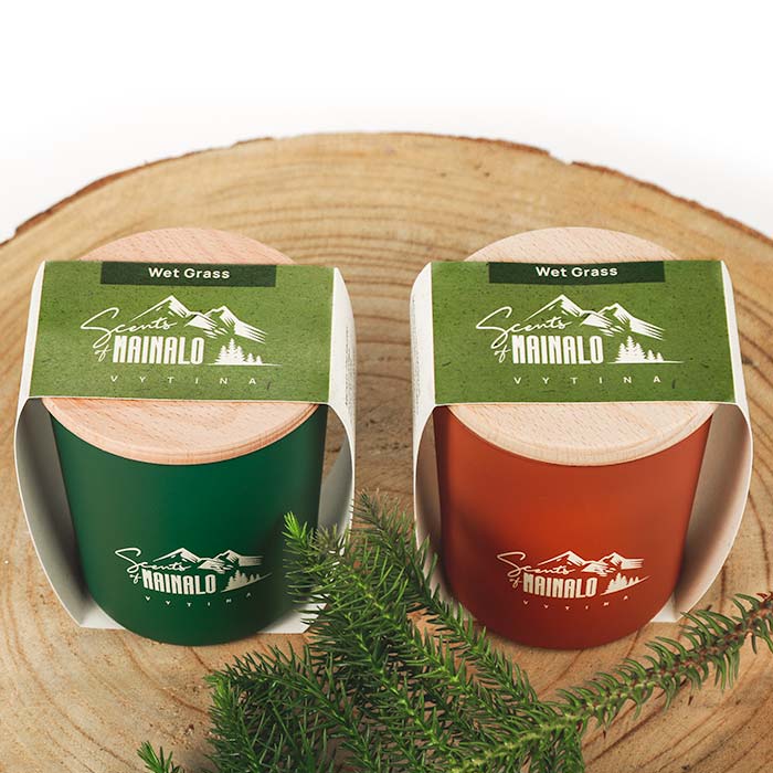 Κεριά Manalo με φυσικά αρώματα σε φόντο κλαδιού.
