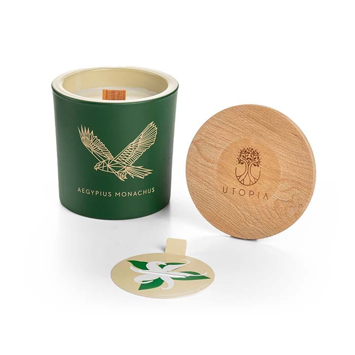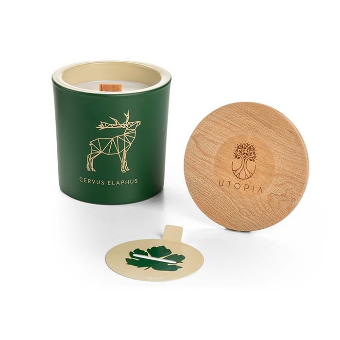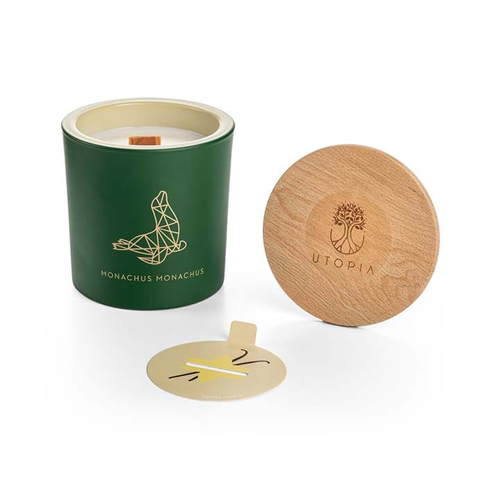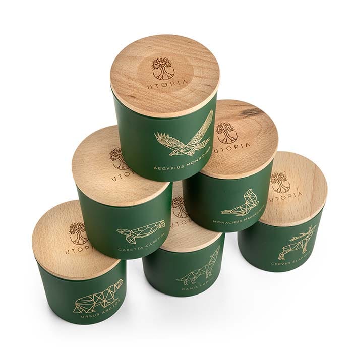 Πράσινα κεριά με σχέδια ζώων και το λογότυπο Utopia