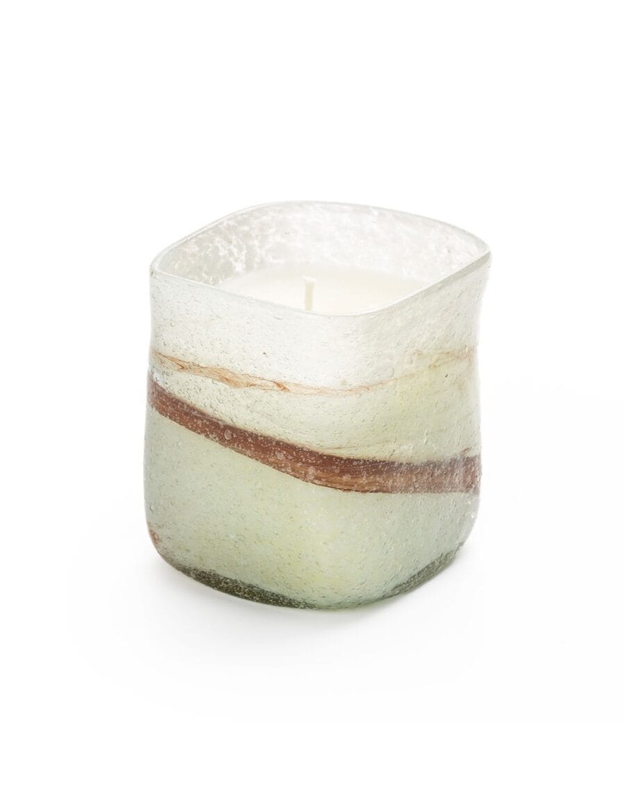 Τετράγωνο δοχείο από φυσητό λευκό γυαλί με καφέ περιμετρικό κορδόνι με αρωματικό φυτικό κερί