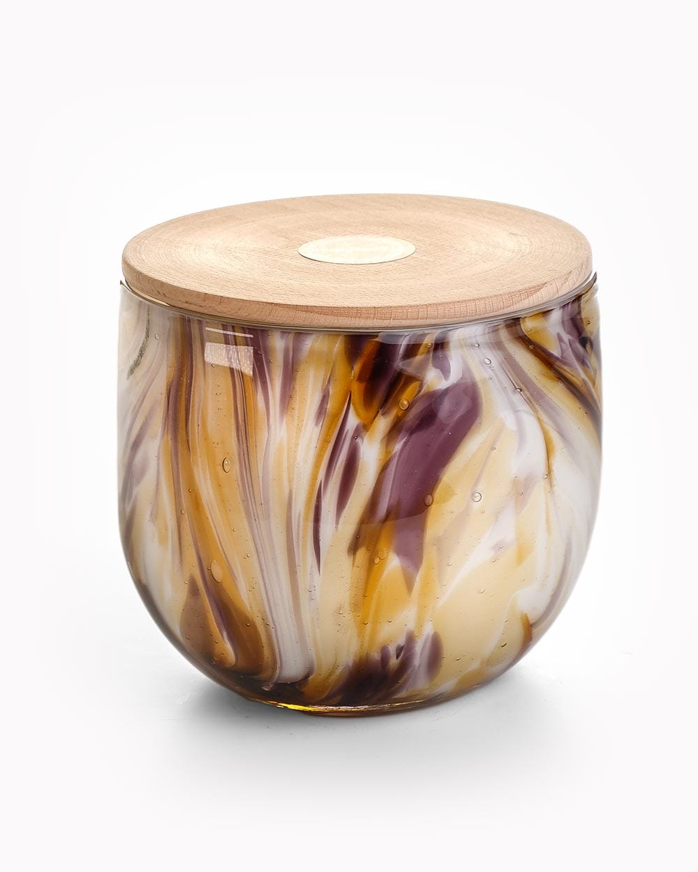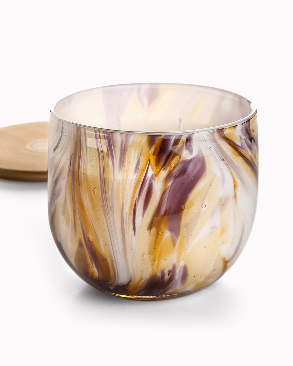 Δοχείο από φυσητό γυαλί με φωτεινές και χαρούμενες κίτρινες και μωβ πινελιές και αρωματικό φυτικό κερί σόγιας