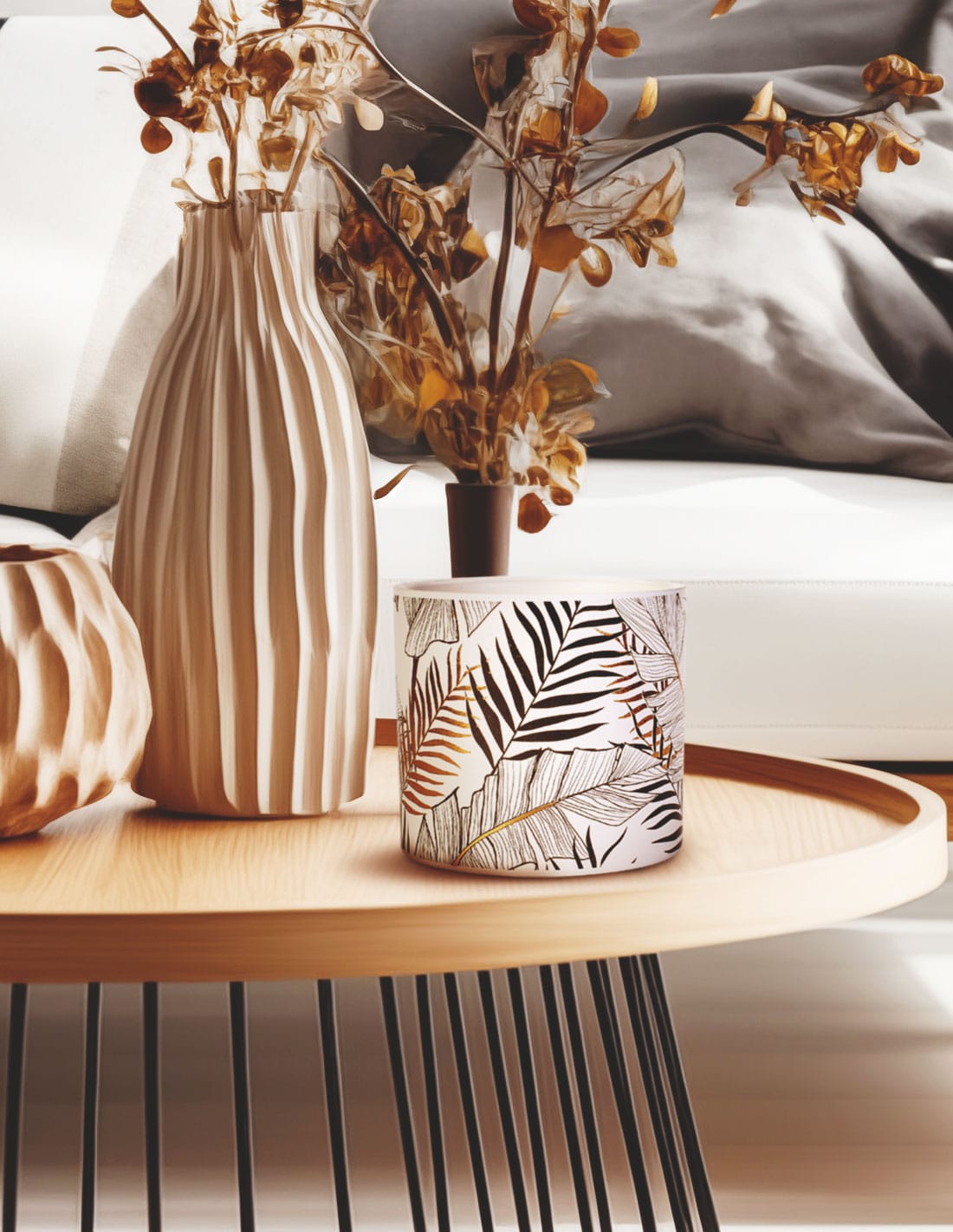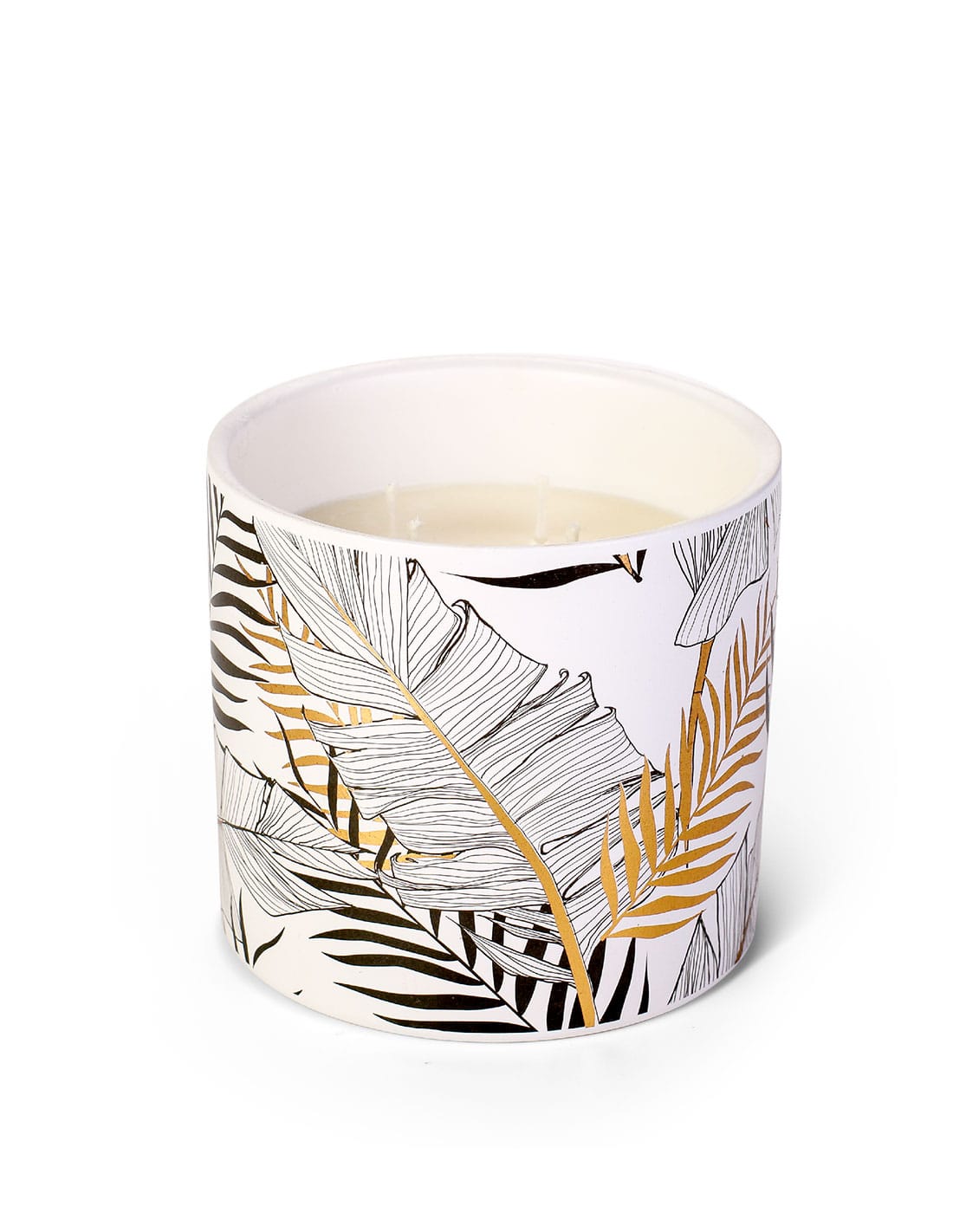 Κεραμικό δοχείο της σειράς Exotic σε λευκό χρώμα με χρυσά και μαύρα kentia musa και φυτικό αρωματικό κερί