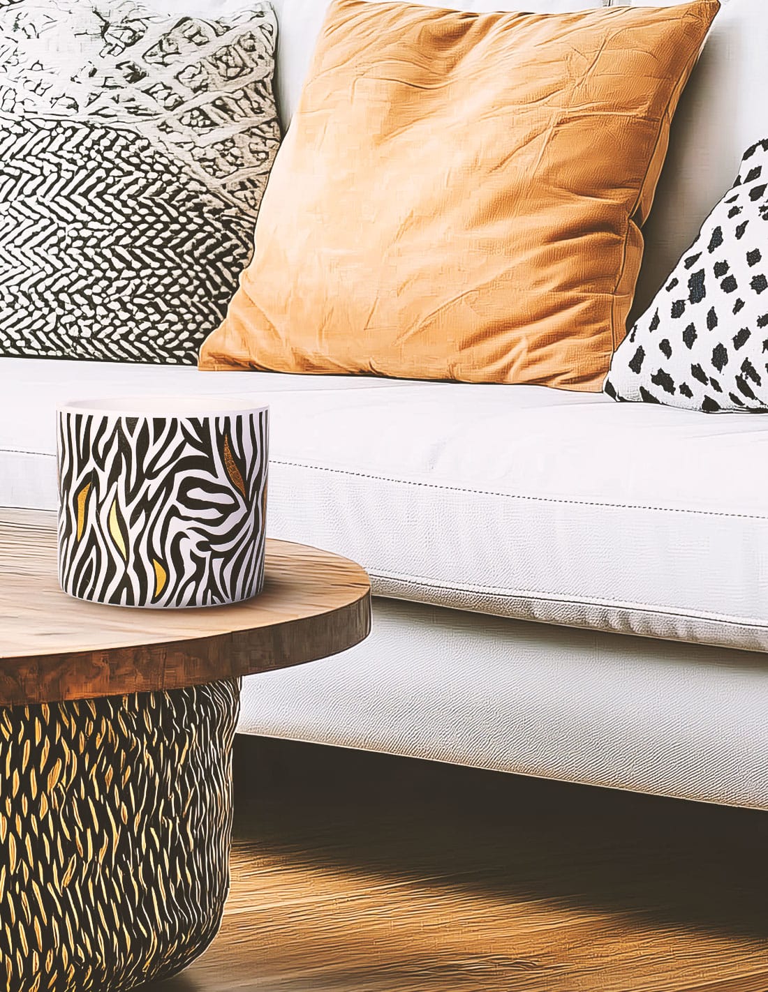 Κεραμικό δοχείο της σειράς Exotic σε μαύρο χρώμα με μαύρες γραμμές zebra και φυτικό αρωματικό κερί