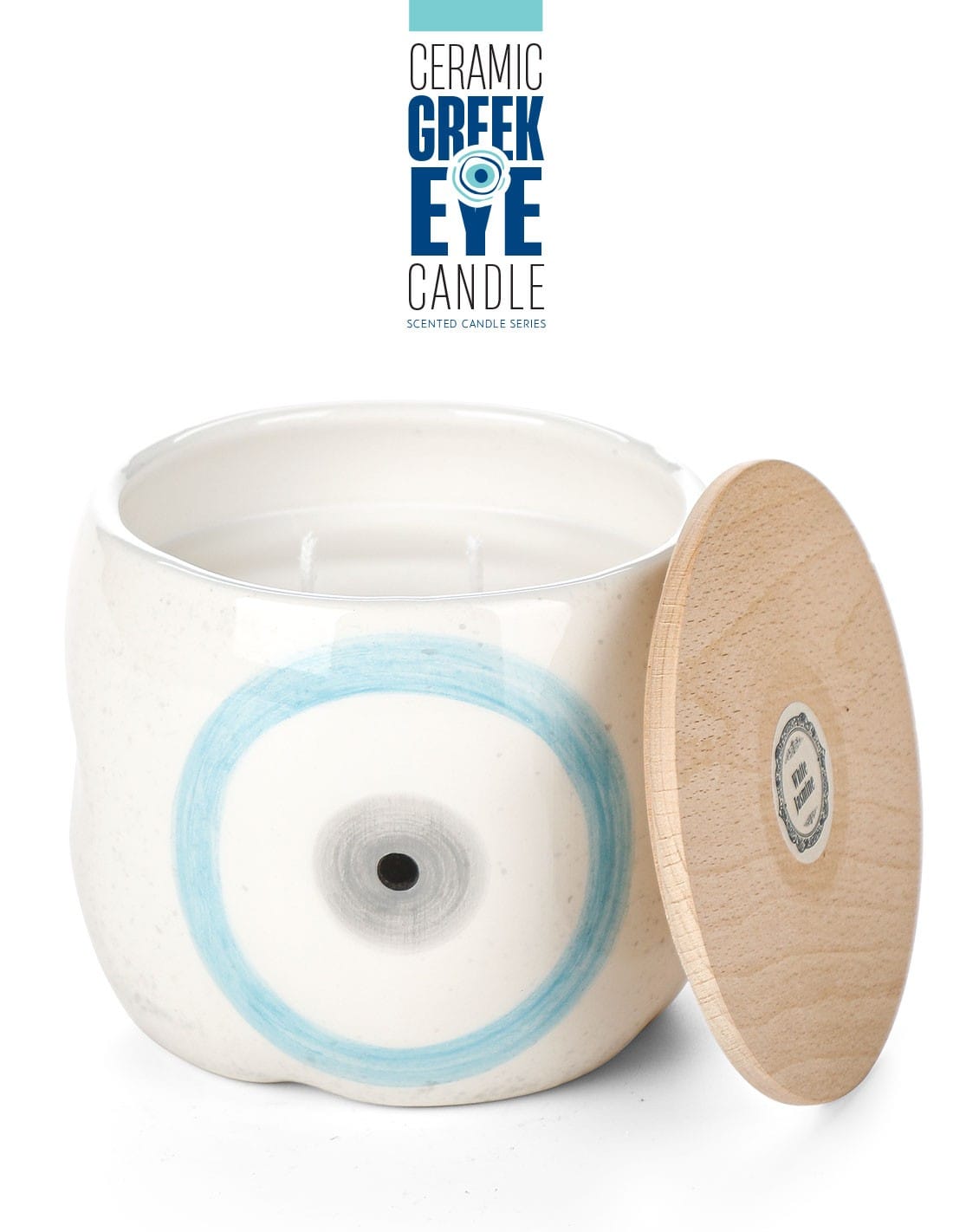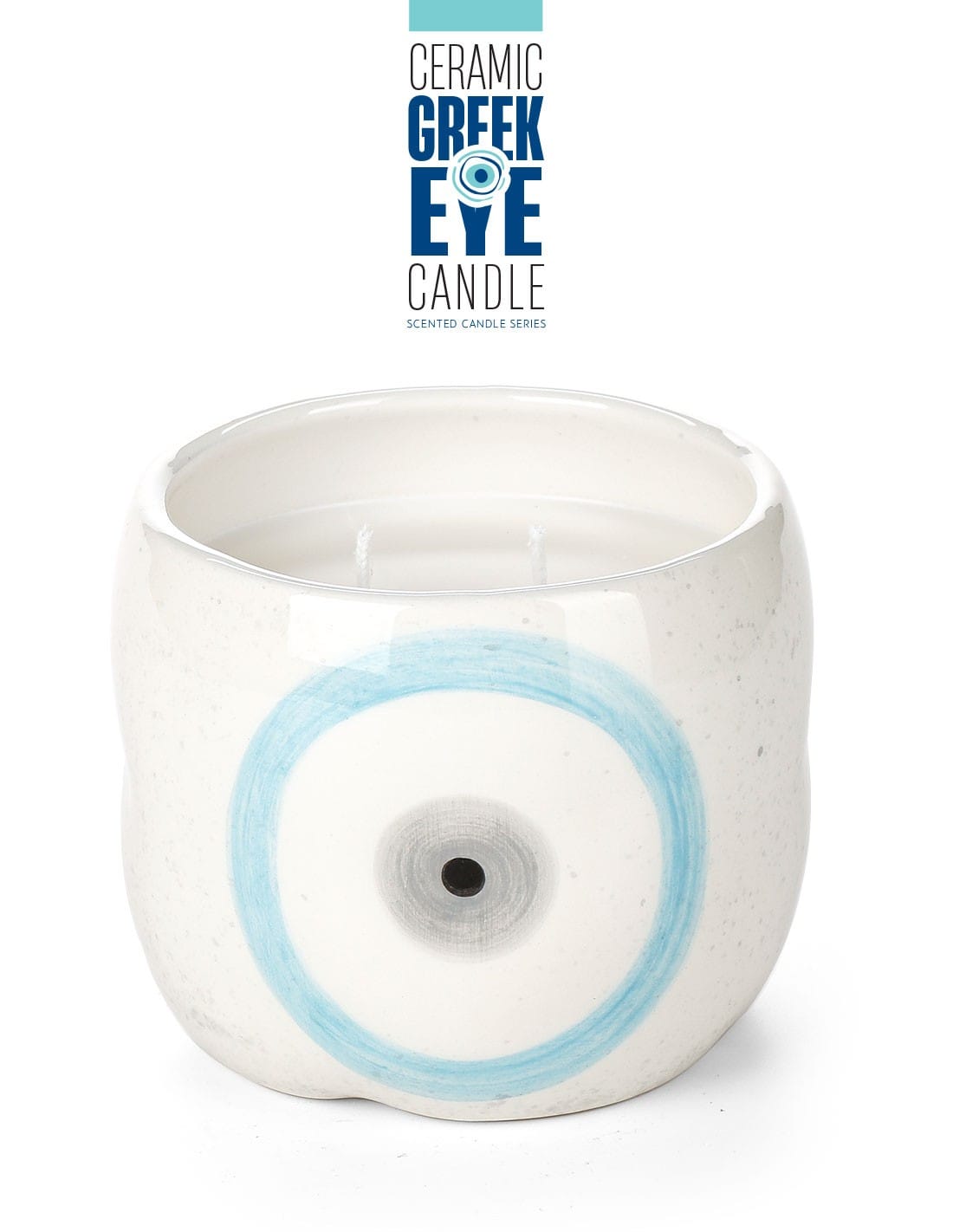 Kεραμικό δοχείο στα χρώματα του Αιγαίου με ζωγραφισμένο γαλάζιο μάτι και φυτικό αρωματικό κερί