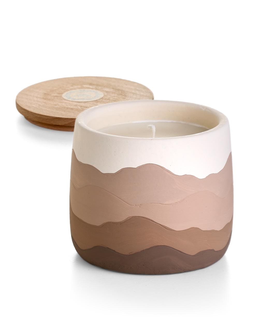 Κερί σε τσιμεντένιο δοχείο με μπεζντεγκραντέ σχέδιο και ξύλινο καπάκι. Μοντέρνος σχεδιασμός που ταιριάζει σε κάθε χώρο.