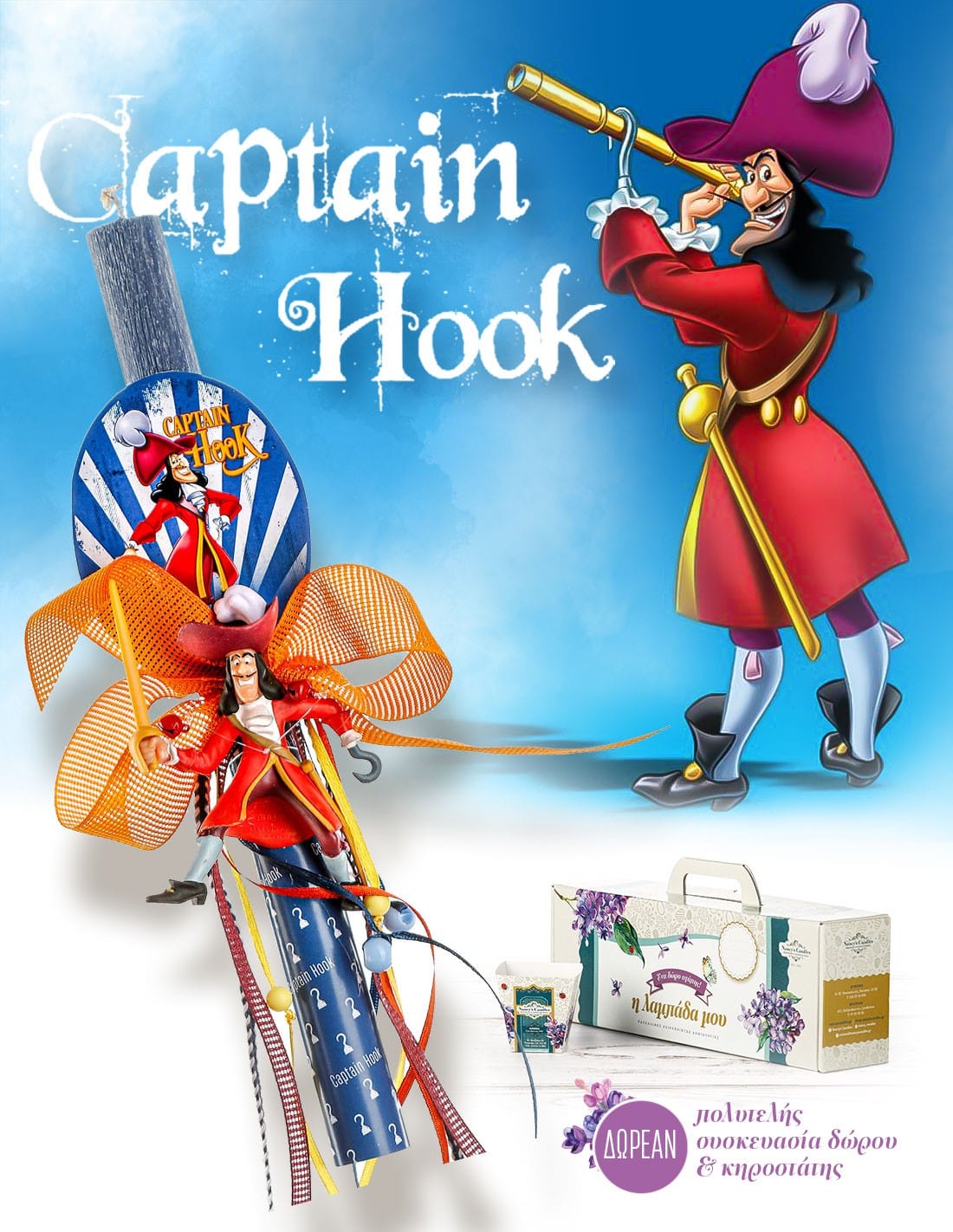 • Αγορίστικη αρωματική λαμπάδα εμπνευσμένη από τον εμβληματικό Captain Hook, τον πιο συναρπαστικό χαρακτήρα της αγαπημένης ιστορίας του Peter Pan.