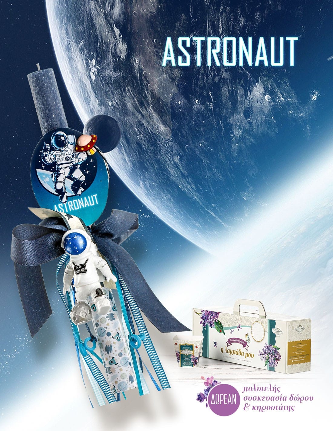 • Αρωματική αγορίστικη λαμπάδα με επιτραπέζιο διακοσμητικό αστροναύτη που παίζει μπάλα με το φεγγάρι.