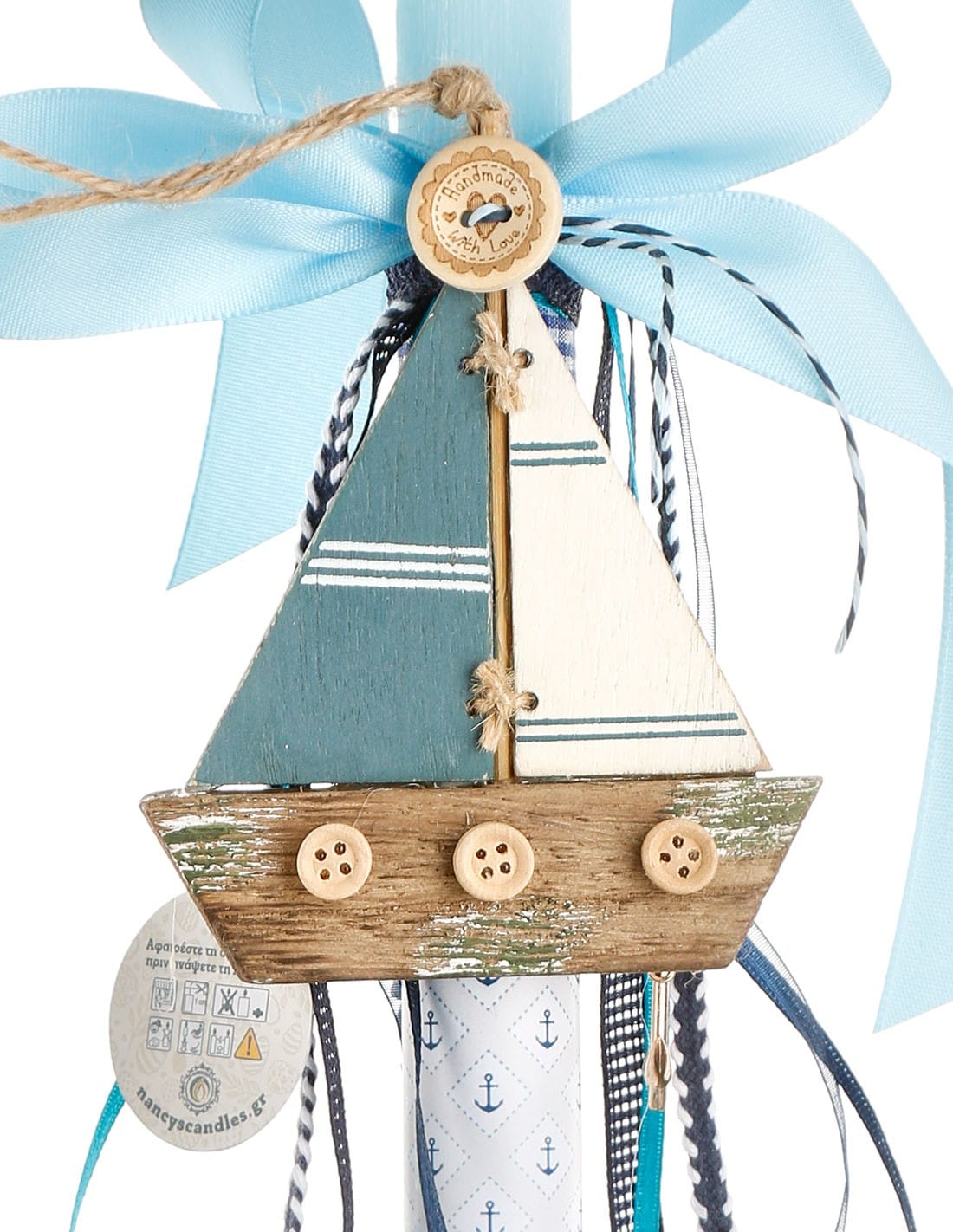 • Αρωματική αγορίστικη λαμπάδα με ξύλινο θαλασσί καραβάκι, στολισμένη με κορδέλες, χάντρες και επιλεγμένα στολίδια.