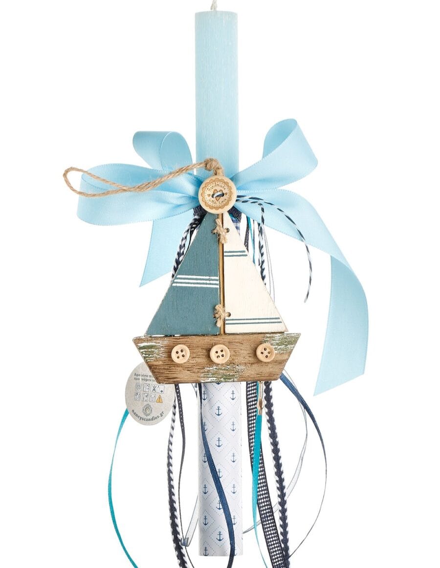 Αγορίστικη λαμπάδα με ξύλινο θαλασσί καραβάκι