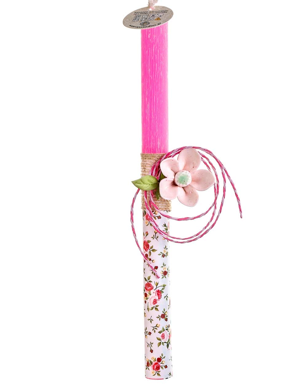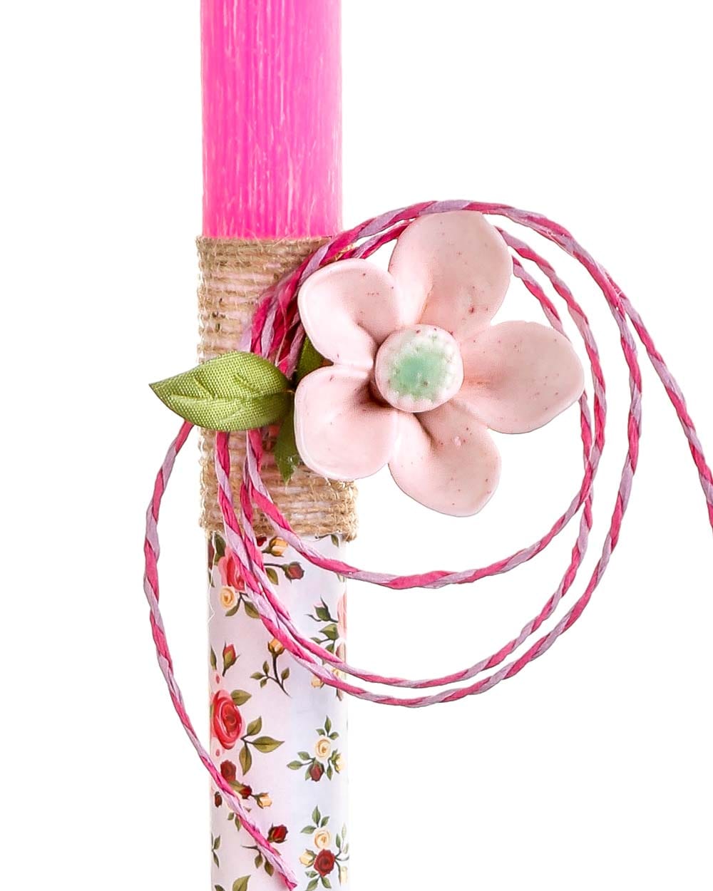 • Το διακοσμητικό στοιχείο ολοκληρώνεται με στριφτό κορδόνι σε ταιριαστά χρώματα, αγκαλιάζοντας τη λαμπάδα και αναδεικνύοντας το κεραμικό λουλούδι ως κεντρικό σημείο.