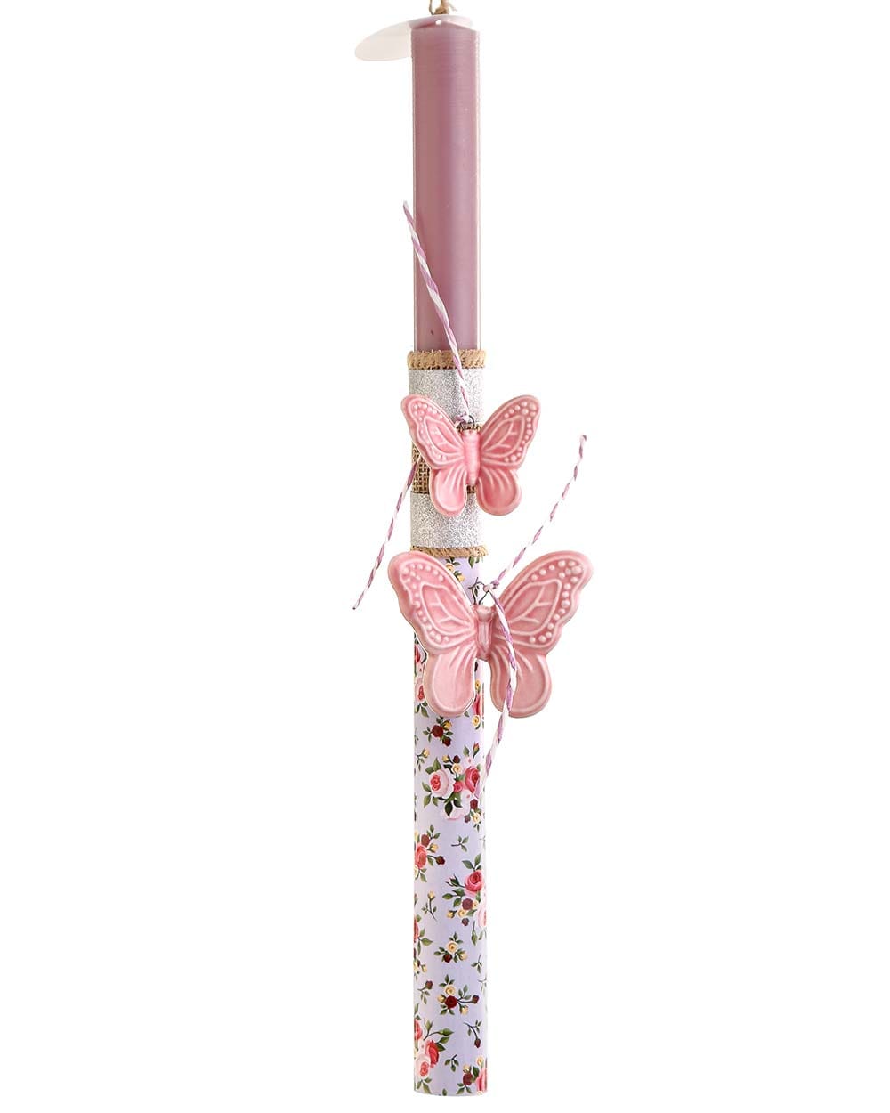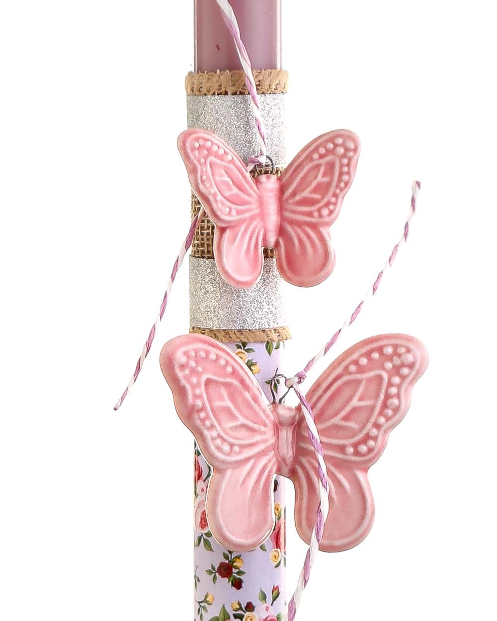 Χειροποίητη πασχαλινή λαμπάδα με ροζ πορσελάνινες πεταλούδες