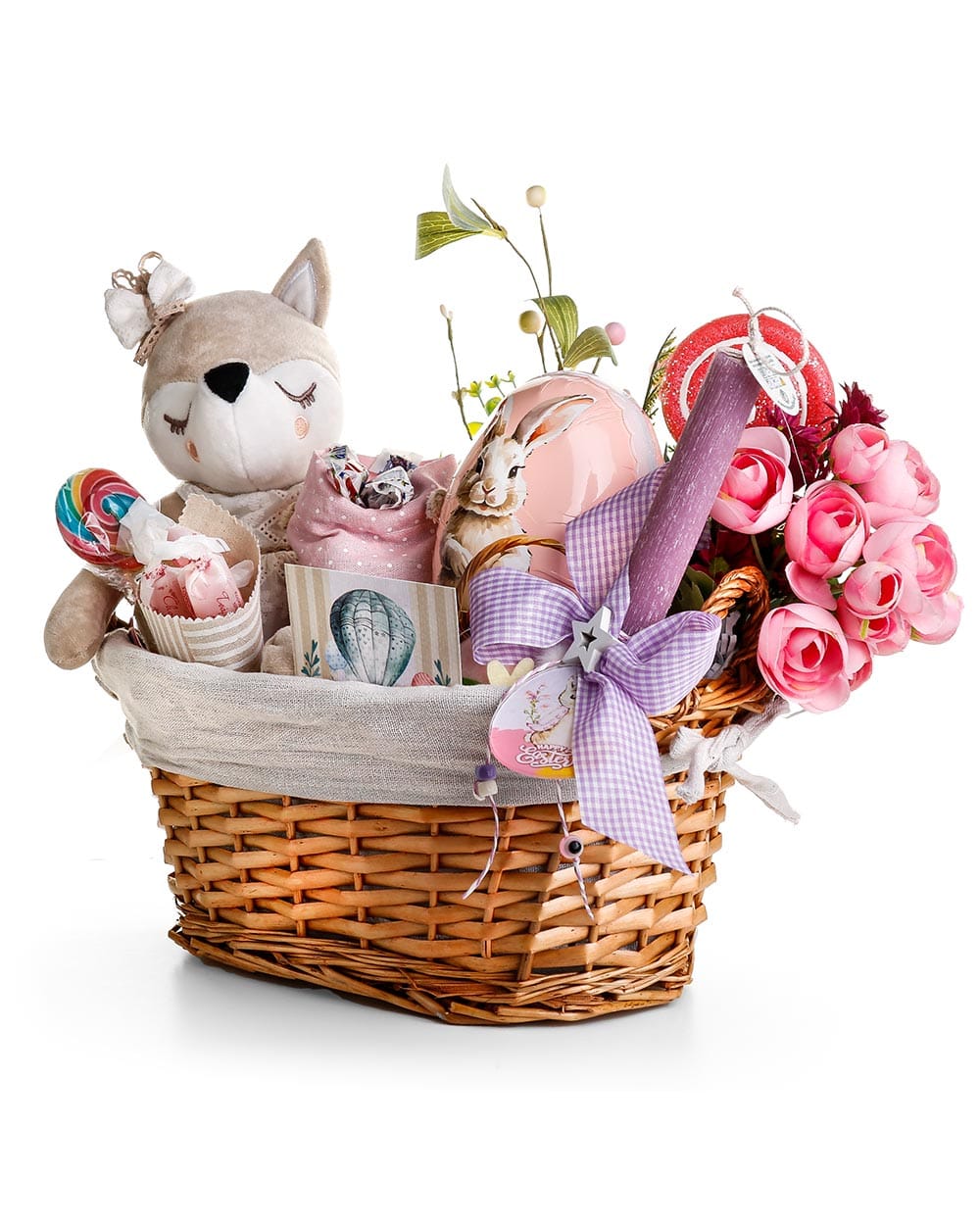 Πασχαλινό Καλαθάκι με λαμπάδα, δώρα και λιχουδιές – αλεπουδίτσα