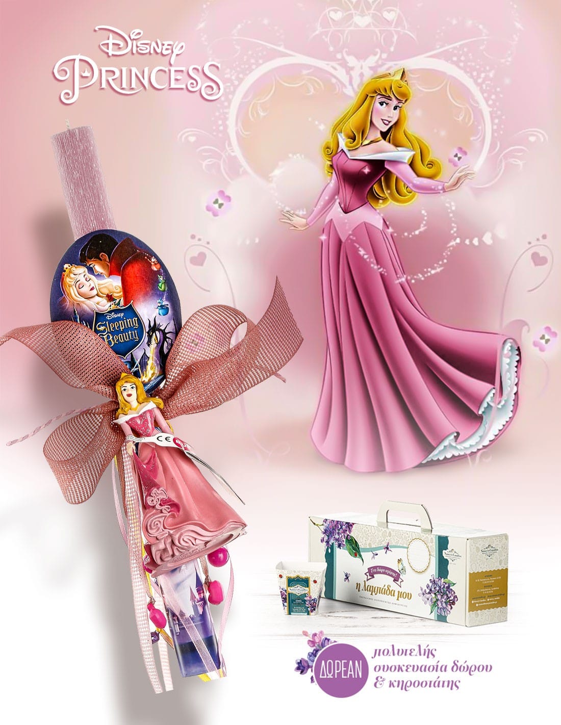 • Κοριτσίστικη αρωματική λαμπάδα με αυθεντική φιγούρα Ωραία Κοιμωμένη, εμπνευσμένη από τον μαγευτικό κόσμο της ομώνυμης ταινίας.