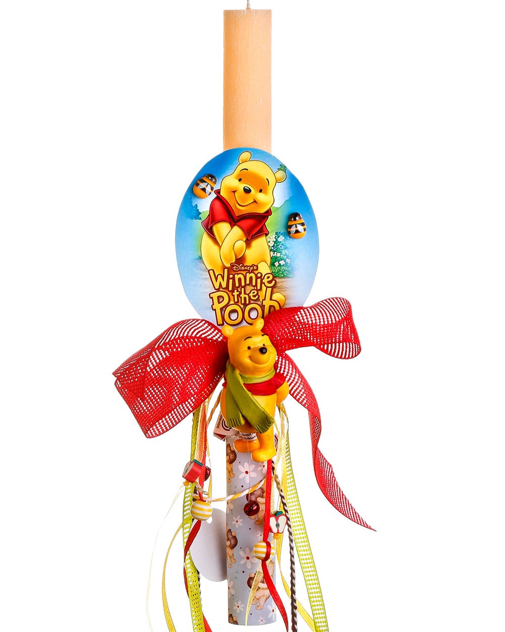 • Κοριτσίστικη αρωματική λαμπάδα με αυθεντική φιγούρα Winnie the Pooh, διακοσμημένη με  κομψές κορδέλες και λαμπερές χάντρες.