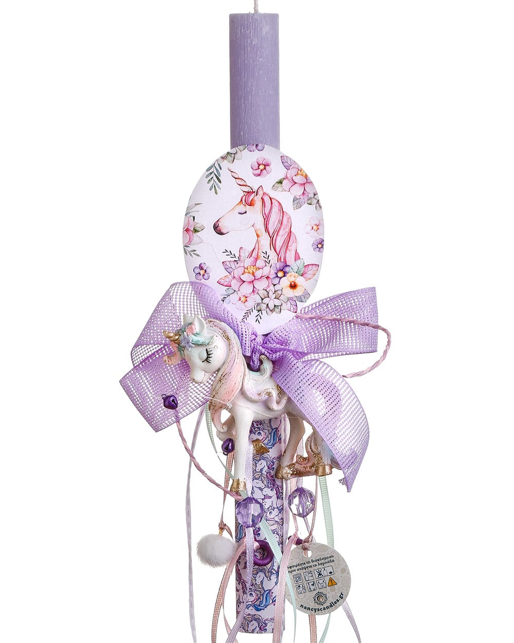• Κοριτσίστικη αρωματική πασχαλινή λαμπάδα με μινιατούρα από πορσελάνη μονόκερο ζωγραφισμένο στο χέρι, διακοσμημένη με φίνα δαντέλα, κορδέλες και λαμπερές χάντρες.