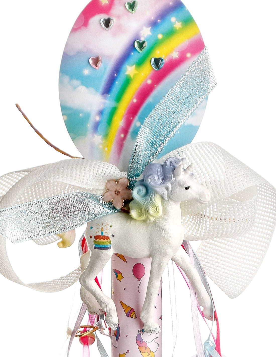 • Κοριτσίστικη αρωματική πασχαλινή λαμπάδα με μινιατούρα μονόκερο ζωγραφισμένο στο χέρι, διακοσμημένη με φίνα δαντέλα, κορδέλες και λαμπερές χάντρες, ιδανική για ένα ονειρικό και κομψό πασχαλινό δώρο.
