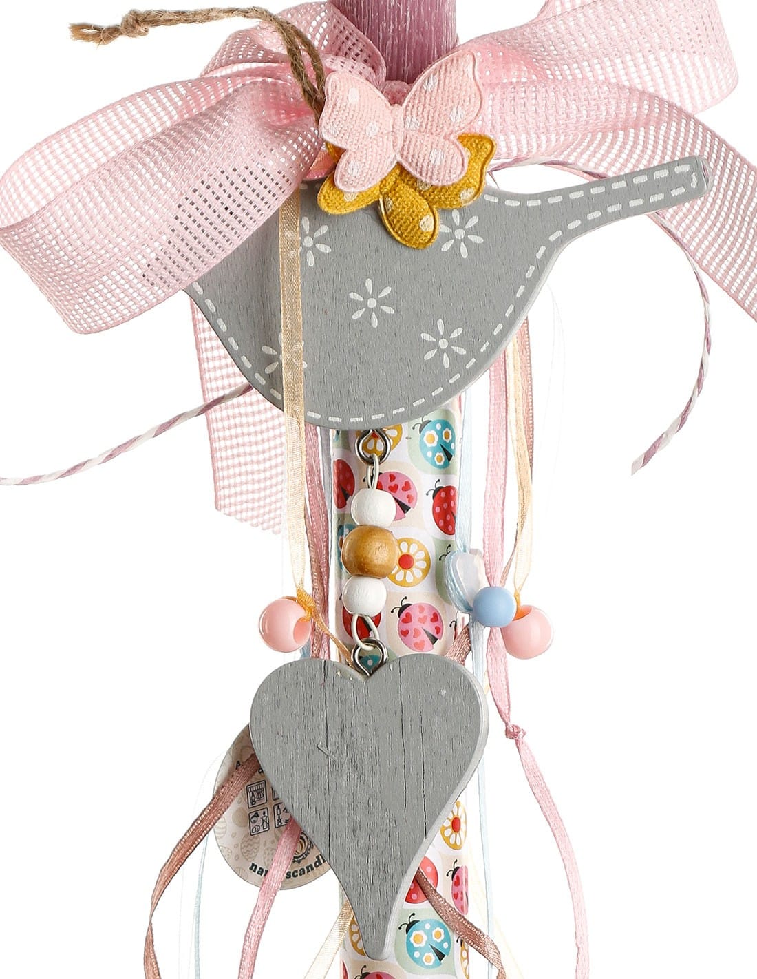 Πασχαλινή αρωματική λαμπάδα για κορίτσια με ξύλινο πουλάκι και καρδιά