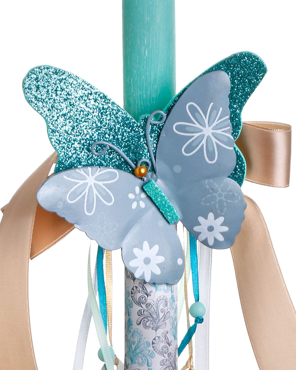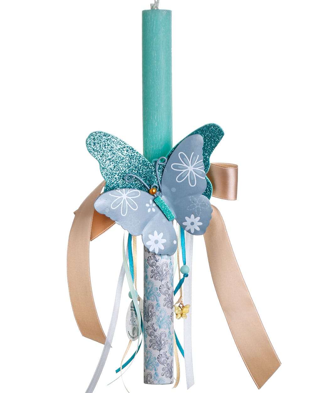 • Ρομαντική αρωματική λαμπάδα με μεταλλική πεταλούδα σε ραφ και τυρκουάζ αποχρώσεις