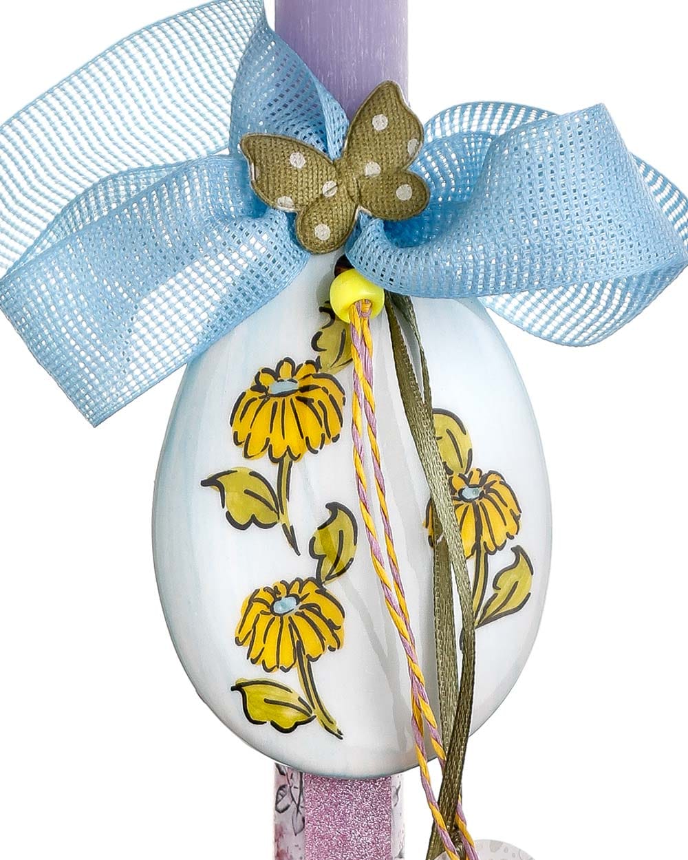 Χειροποίητη πασχαλινή λαμπάδα με κεραμικό αυγό – γαλάζιο με κίτρινες μαργαρίτες