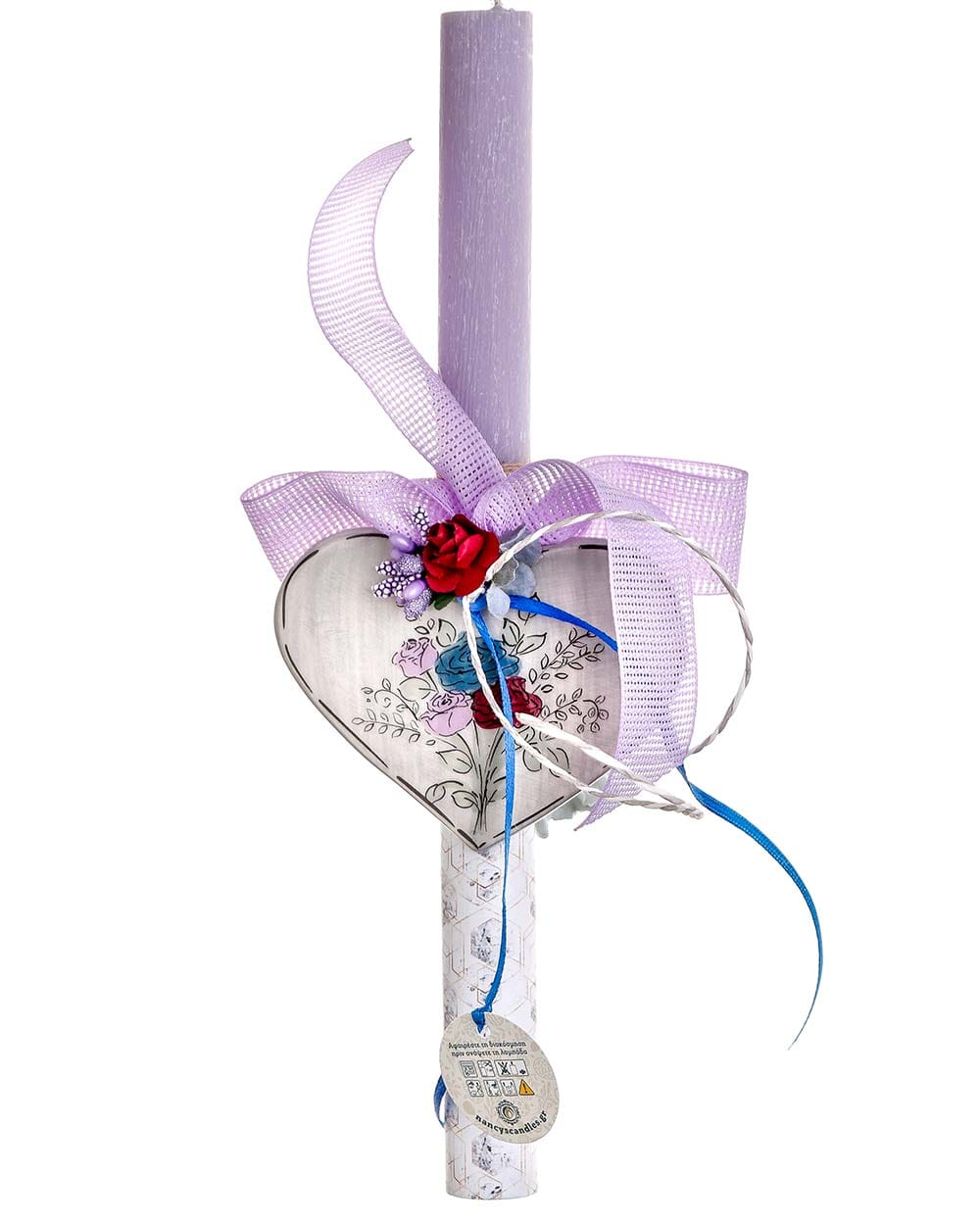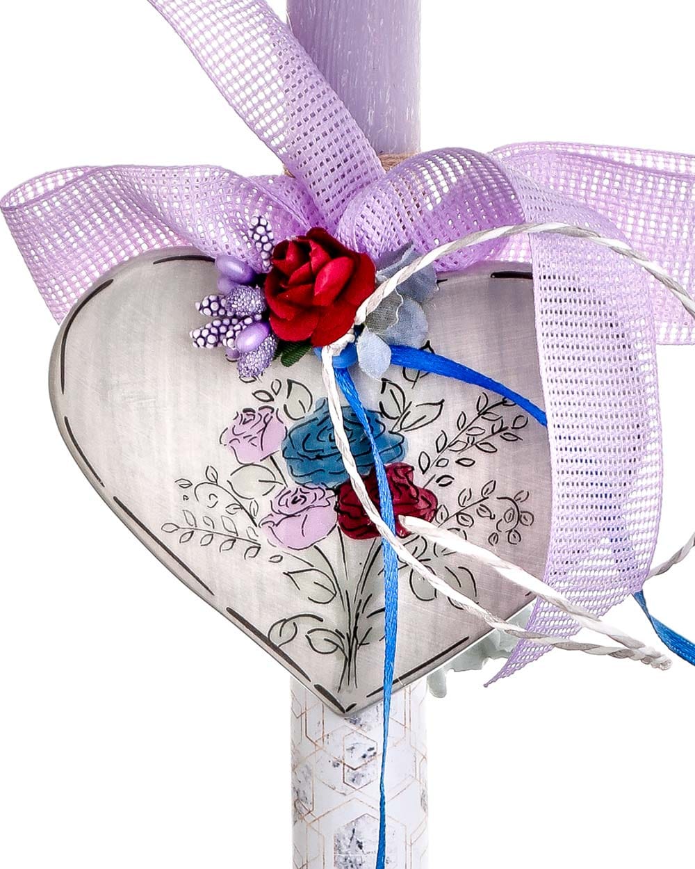 Χειροποίητη πασχαλινή λαμπάδα με κεραμική καρδιά – γκρι με τριαντάφυλλα