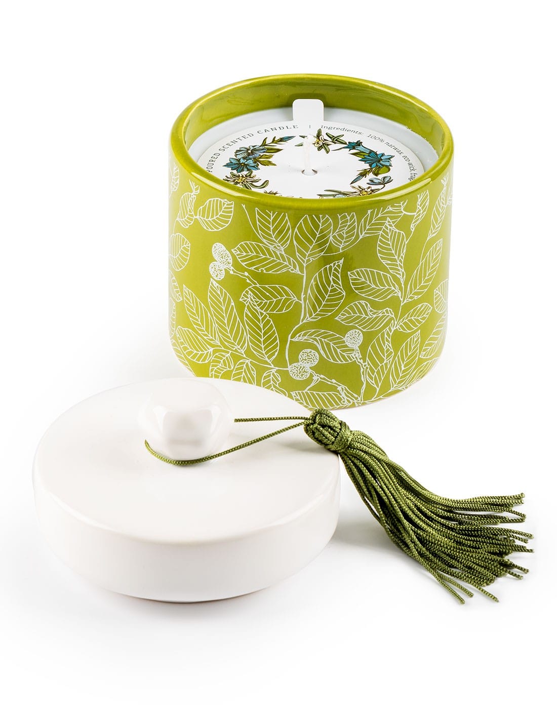 Κομψό κηροπήγιο από πορσελάνη, σε λαδί χρώμα με λευκό περίγραμμα φύλλων, με καπάκι και αρωματικό φυτικό κερί