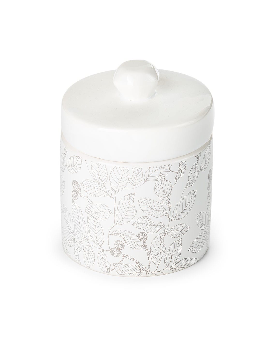 Κομψό κηροπήγιο από πορσελάνη, σε λαδί χρώμα με λευκό περίγραμμα φύλλων, με καπάκι και αρωματικό φυτικό κερί