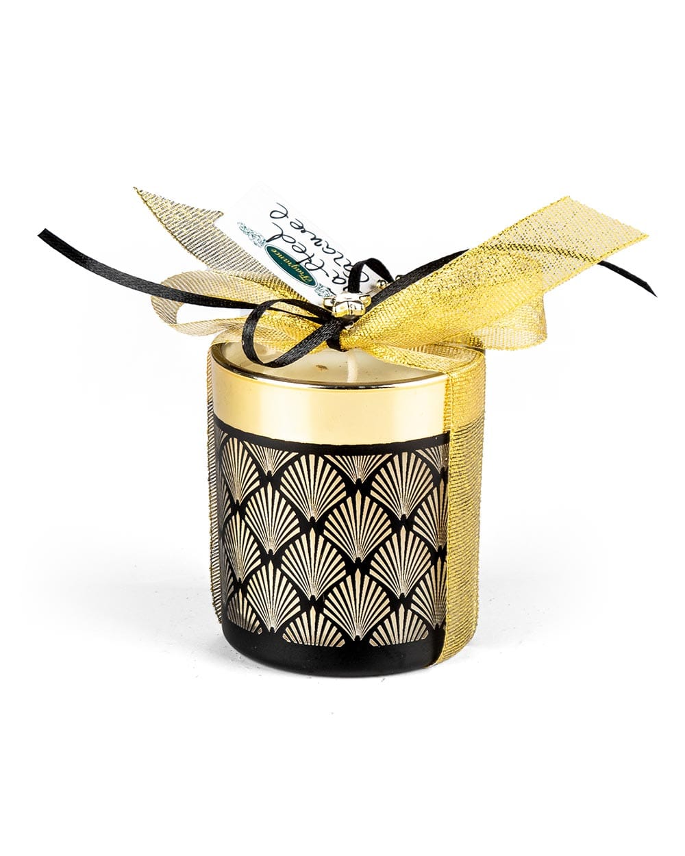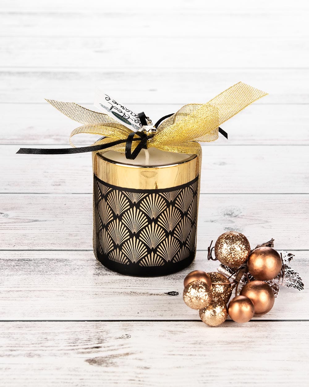 Φυτικό κερί σε κηροπήγιο μαύρου και χρυσού χρώματος με Art Deco σχέδιο και εορταστική διακόσμηση.