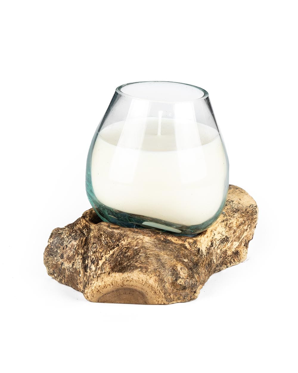 Μοναδικό χειροποίητο κερί μέσα σε φυσητό γυαλί που έχει πάρει το σχήμα της ρίζας δέντρου όπου ακουμπά. Ένα έργο τέχνης που ενώνει τη φυσικότητα του ξύλου με την κομψότητα του γυαλιού.