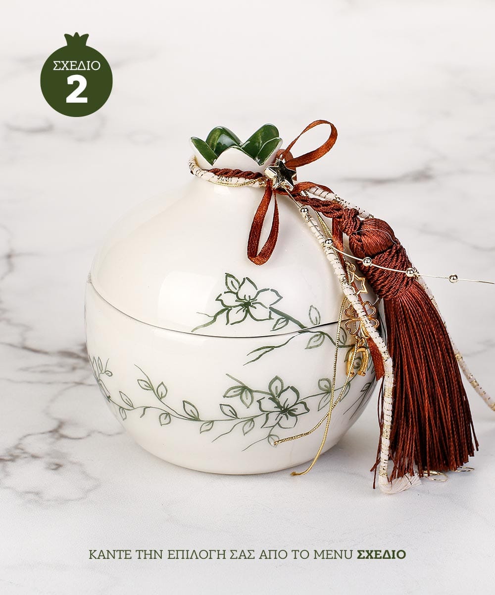 • Το χειροποίητο κεραμικό ρόδι είναι ζωγραφισμένο στο χέρι σε αποχρώσεις λευκού και λαδί – πράσινου, με λεπτομέρειες εμπνευσμένες από τη βοτανική αρμονία και την ελληνική κεραμική παράδοση.