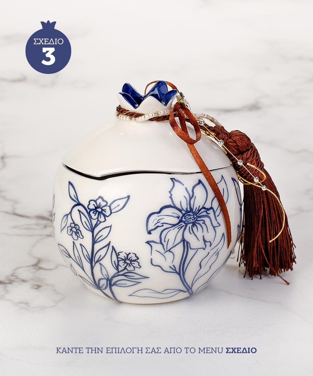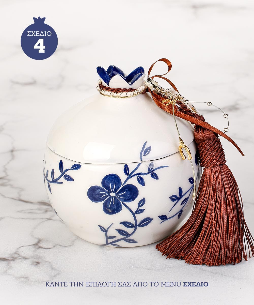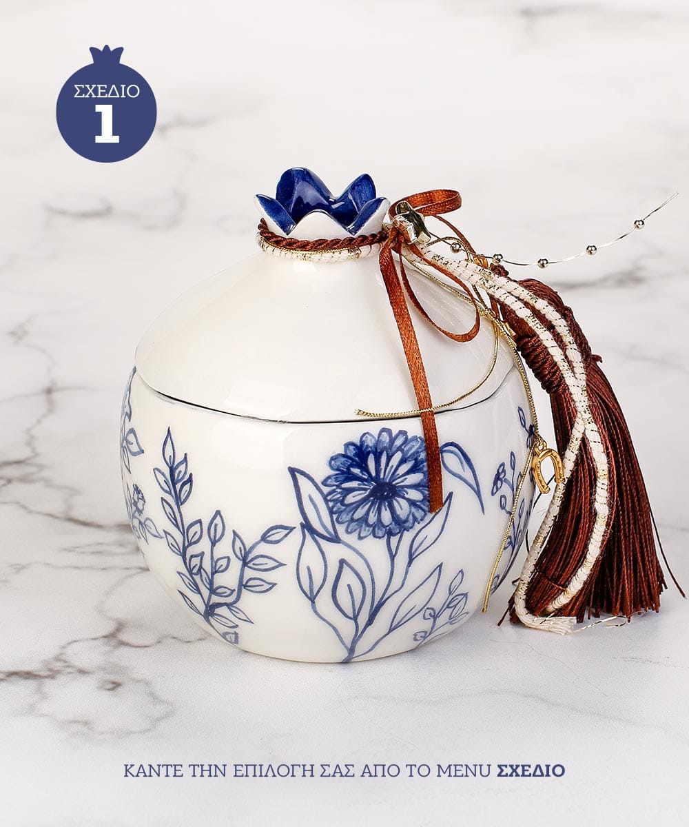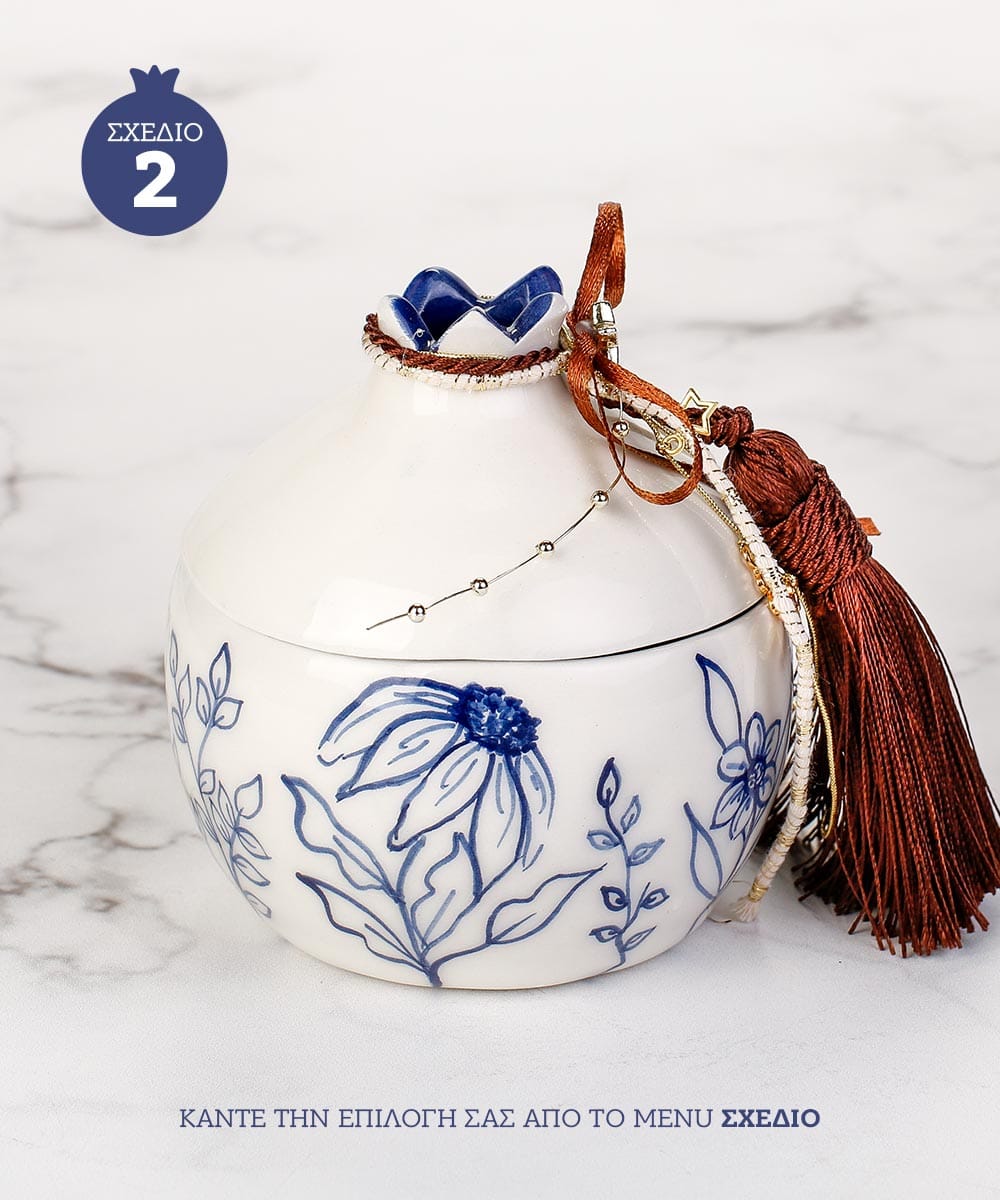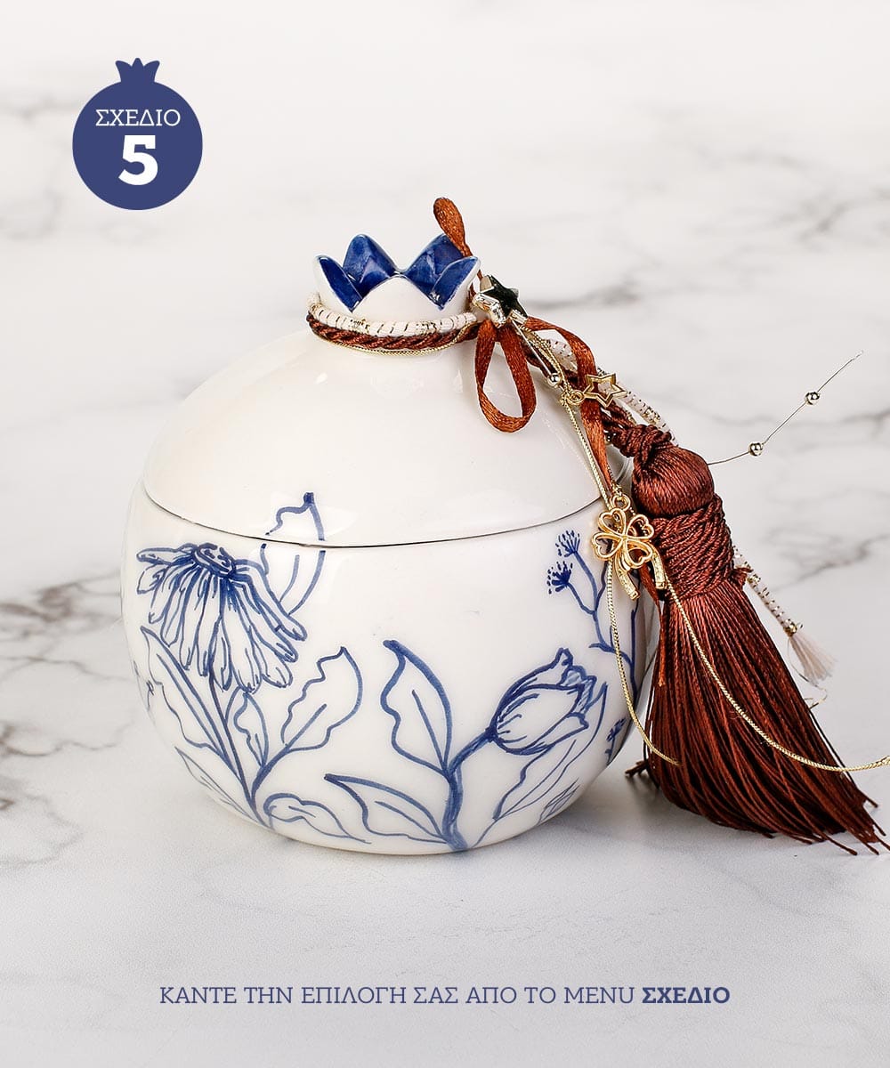 • Το χειροποίητο κεραμικό ρόδι είναι ζωγραφισμένο στο χέρι σε αποχρώσεις λευκού και βαθύ μπλε, με λεπτομέρειες εμπνευσμένες από τη βοτανική αρμονία και την ελληνική κεραμική παράδοση.