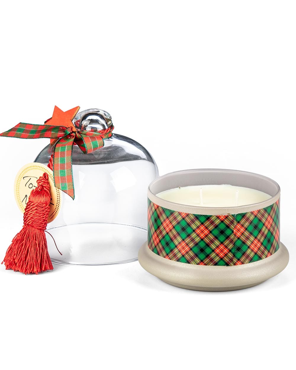 Αρωματικό φυτικό κερί σε γυάλινο περιέκτη με κόκκινο-πράσινο καρό σχέδιο, καλυμμένο με διάφανη καμπάνα.