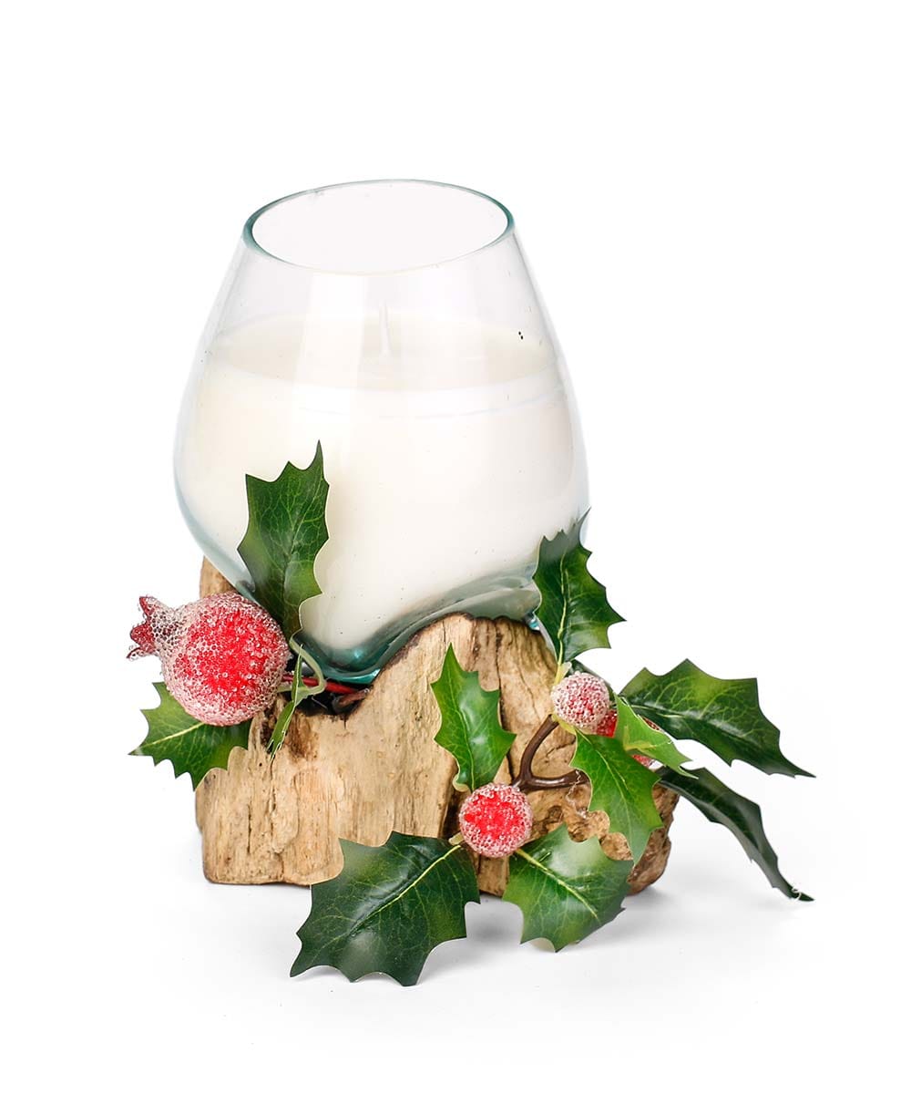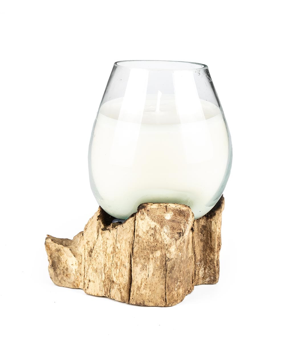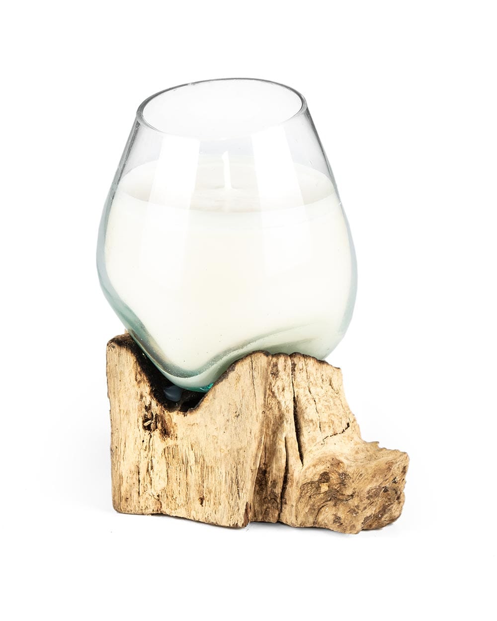 Μοναδικό χειροποίητο κερί μέσα σε φυσητό γυαλί που έχει πάρει το σχήμα της ρίζας δέντρου όπου ακουμπά. Ένα έργο τέχνης που ενώνει τη φυσικότητα του ξύλου με την κομψότητα του γυαλιού.