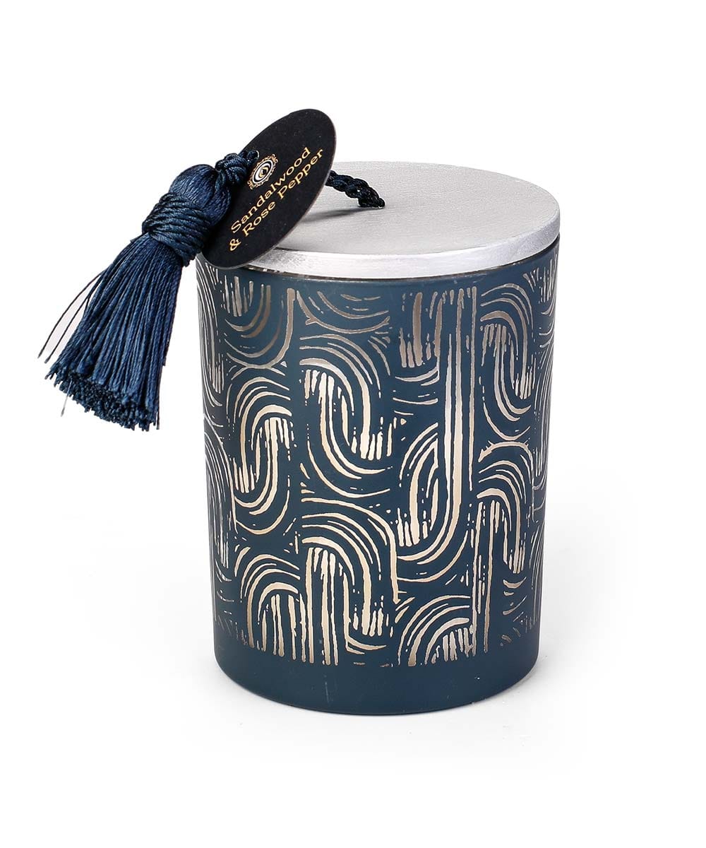 Σκούρο μπλε κερί με ασημί καμπύλες. Μυστηριώδες, κομψό και απόλυτα γιορτινό.